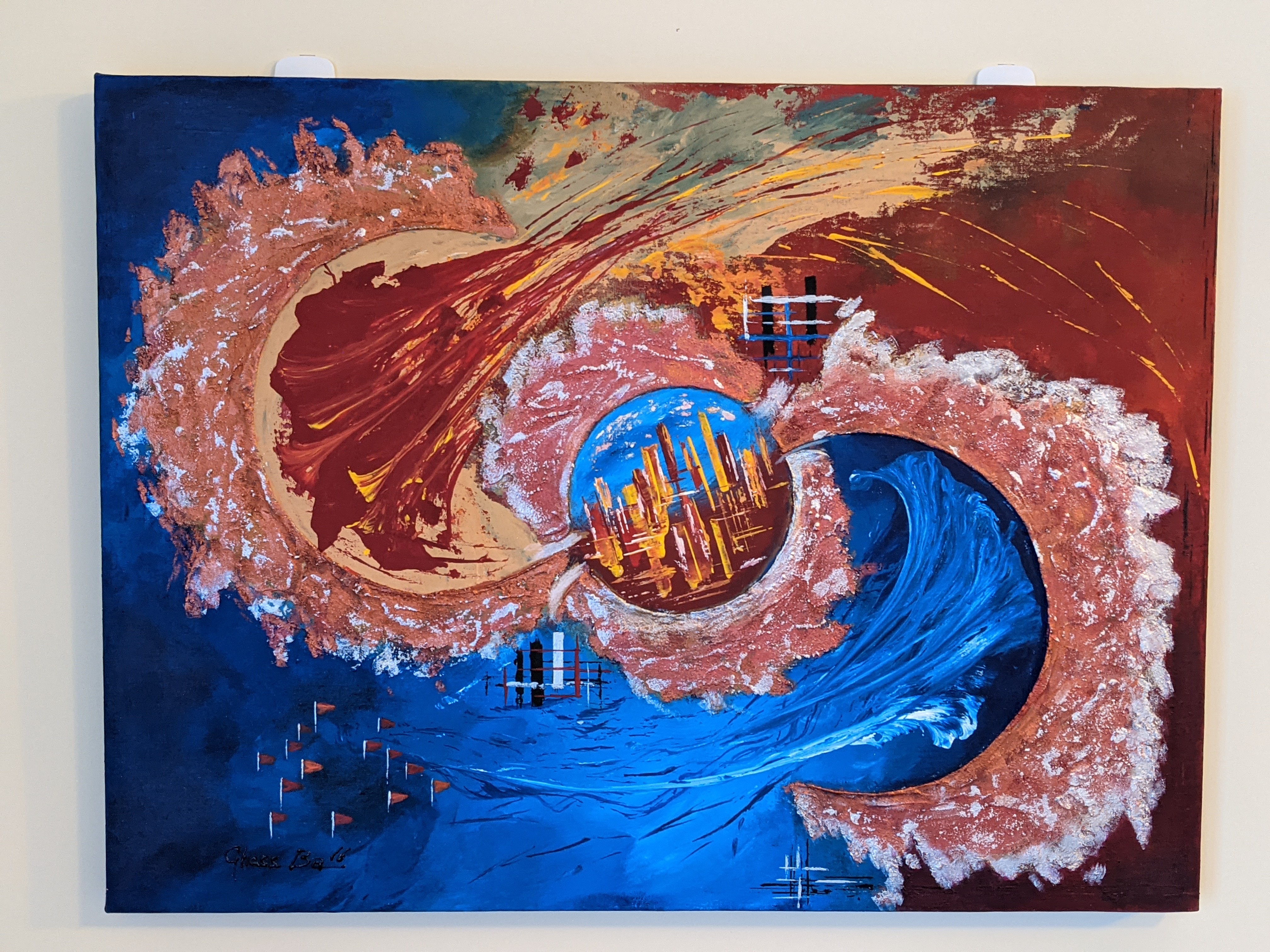 An abstract artwork inspired by the tragedy of the refugees fleeing the chaos afflicting their country by the civil war.